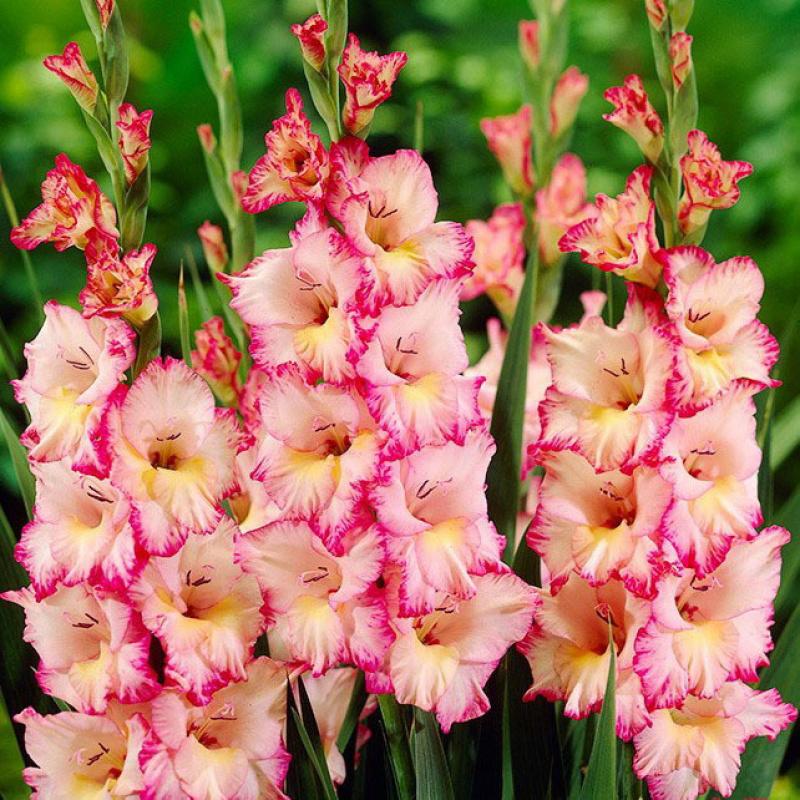 Шикарный гладиолус гибридный Присцилла (Priscilla) с чудесными бархатистыми цветками обладает таким богатым соцветием, что может затмить любой букет. Бледно-розовый оттенок цветка плавно превращается к краю в малиновый. Края каждого цвета сильно гофрированы. Соцветие высотой до полуметра, высота цветоноса – около 120 сантиметров. Предпочитает цвести в открытом грунте на открытых солнечных площадках в середины лета. Цветы крупные, на одном стебле может постепенно открыть до 15 бутонов. Великолепно смотрится в миксбордерах и на отдельных клумбах. Почву желательно обильно поливать во время цветения.