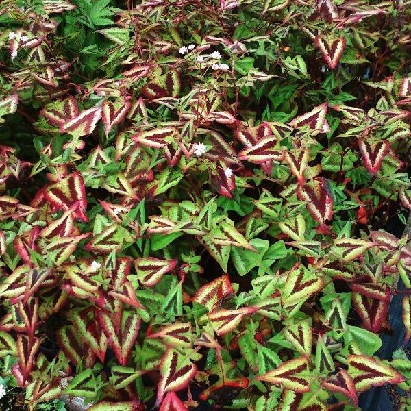 Саженцы горца мелкоголового Пёпл Фэнтэзи (Persicaria micrantha Purple Fantasy), благодаря яркой раскраске листьев, могут выполнять функцию акцента в цветочной композиции. Яркие зеленые листья по центру украшены пурпурно-сливовым треугольником, обрамленным нежно-зеленым кантом. Листочек кажется бархатным из-за множества ворсинок бордового цвета. Цветет растение с середины лета, но цветы особо не отражаются на его декоративных качествах – меленькие розово-белые цветы теряются на фоне яркой листвы. В высоту растение достигает 50-60 сантиметров. Наиболее яркой окраски горец достигает при посадке на солнечных участках, возможна легкая полутень.
