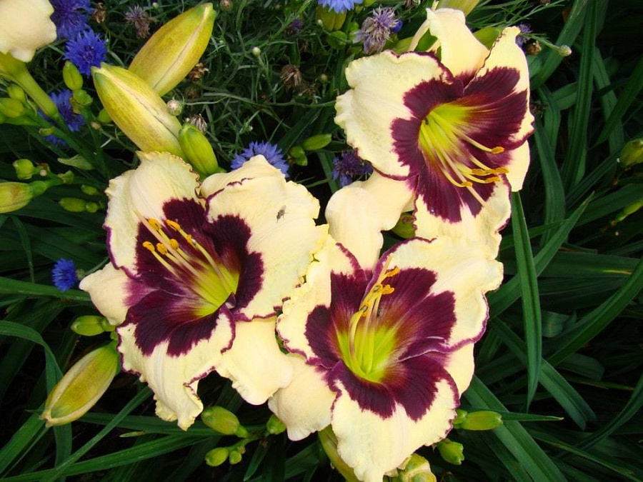 Окраска цветка : Кремово-желтая с черно-пурпурным глазом и зеленым горлом