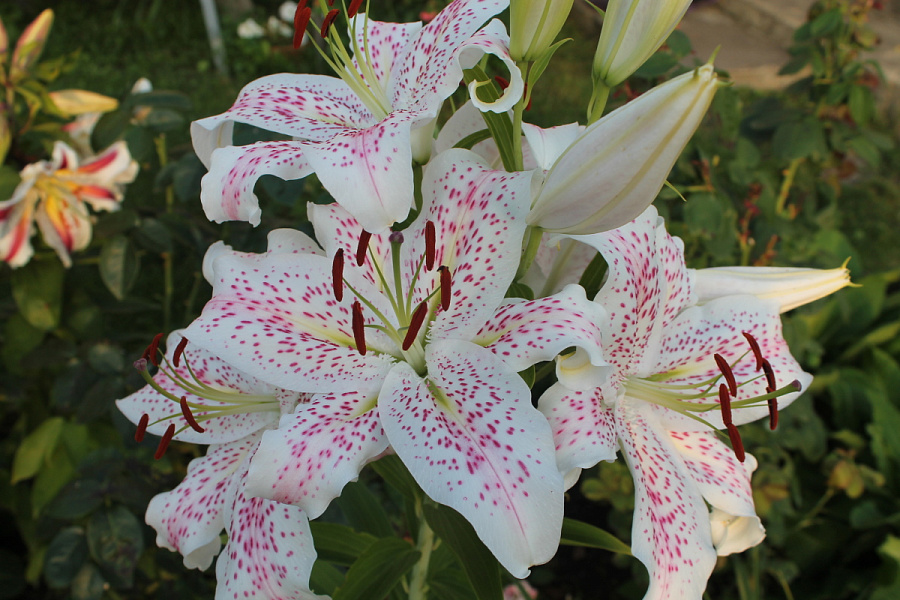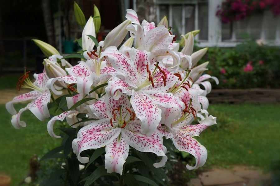 Саженцы и рассада лилии восточной Экстраваганза (Lilium Oriental Hybrid Extravaganza) не уступают по красоте цветков и популярности даже розе – королеве цветов. Высота стеблей этого сорта – 120 см, диаметр крупных цветков – 25 см. На одном стебле распускаются одновременно до 9 цветков. Лепестки волнистые, выгнутые наружу, молочно-белого цвета, с обильным малиновым крапом и розовыми штрихами.
