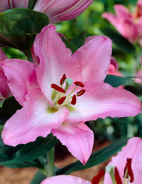 Саженцы и рассада Лилии восточной горшечной Сувенир (Lilium oriental Souvenir) подарят клумбам экзотическую привлекательность. Огромные цветы яркой раскраски на коротких стеблях около 40 см с сильным ароматом покорят каждого любителя буйства красок своей нежностью и размерами. Идеальным местом для посадки будет рыхлая, богатая питательными веществами известковая песчано-глинистая почва с расположением в теплом солнечном или полутеневом месте. Также нужен хороший дренаж. Цветы требуют укрытия на зиму, отлично смотрятся в групповых и смешанных посадках на открытом грунте.