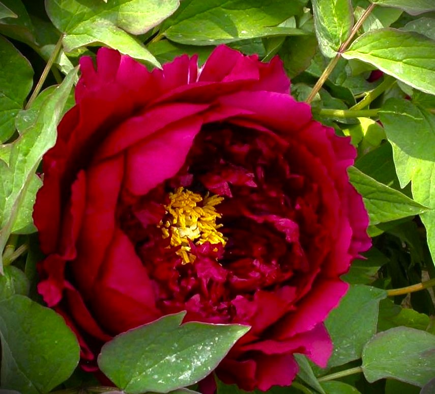 Саженцы пиона древовидного Shining Black Gold (Wu Jin Yao Hui) Превосходный пион, который дает большие, полумахровыми или махровыми цветками в форме розы, иногда встречается форма хризантемы, пурпурно-красного или бордово-красного цвета (зависит от почвы) с еле заметной желтой серединкой из тычинок. Цветки направлены вверх или в сторону; нежный аромат. Цветущий кустарник в зрелом возрасте представляет собой захватывающее зрелище, заслуживающее особого расположения в саду. Длинные стебли с темно зелеными, тонкими листьями и крепкими ветвями. Древовидный пион открывает всю свою красоту, распуская пышные бутоны. Их лепестки удивляют нежностью и тонкостью, а также привлекают взгляд необычной окраской. Древовидные пионы обладает не сильным, но приятным и нежным ароматом. В отличие от травянистого пиона стебли такого растения в осеннее время не увядают, а с каждым годом разрастаются все больше, и со временем кустик приобретает полушаровидную форму. Характерные особенности растения: