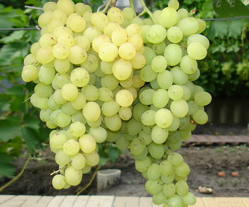 • Грозди средних размеров, конической формы, ягоды также среднего размера и округло-овальной формы и желтовато-зеленого цвета. Пригоден для как употребления сразу после сбора, так и для переработки – изготовления соков и вин.